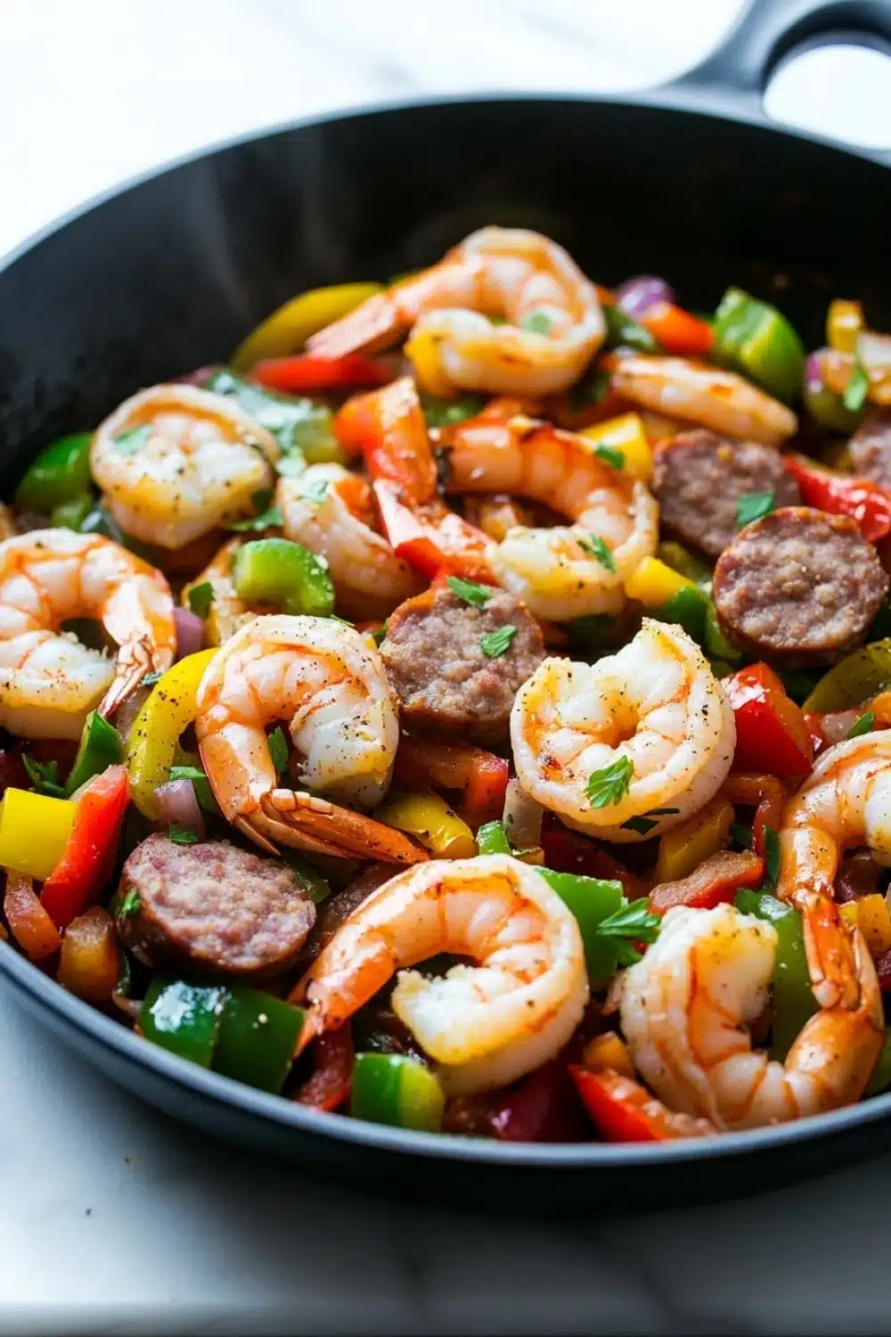 There’s something about the sizzle that pulls you into the kitchen. I remember the first time I made this skillet meal—it was one of those evenings when I got home later than planned and the fridge was looking pretty bare. The smell of the sausage browning was a little distracting—I may have stood there a bit too long just inhaling. Then the peppers and onions hit the pan, their sweet aroma mixing with the smokiness. I wasn’t sure about the timing at first; I think I let the shrimp cook a bit longer than I should have, but the dish still turned out amazing. It filled the kitchen with a comforting warmth that made the day’s chaos fade just a little.