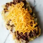 Sprinkle half of the shredded cheddar cheese over the beef layer.
