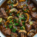 A hearty and tender slow cooker beef dish with mushrooms, perfect for a comforting meal. The beef becomes melt-in-your-mouth tender while the mushrooms add earthy flavor, all cooked slowly to perfection.