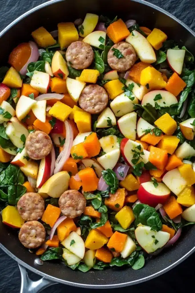 This one-pan meal blends savory sausage with tender autumn vegetables, filling your kitchen with cozy, inviting aromas.