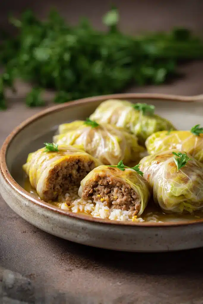 Savor the warmth of tender cabbage leaves wrapped around a hearty blend of beef and rice, all baked in a rich tomato sauce. This dish is comfort on a plate, perfect for gathering around the table.