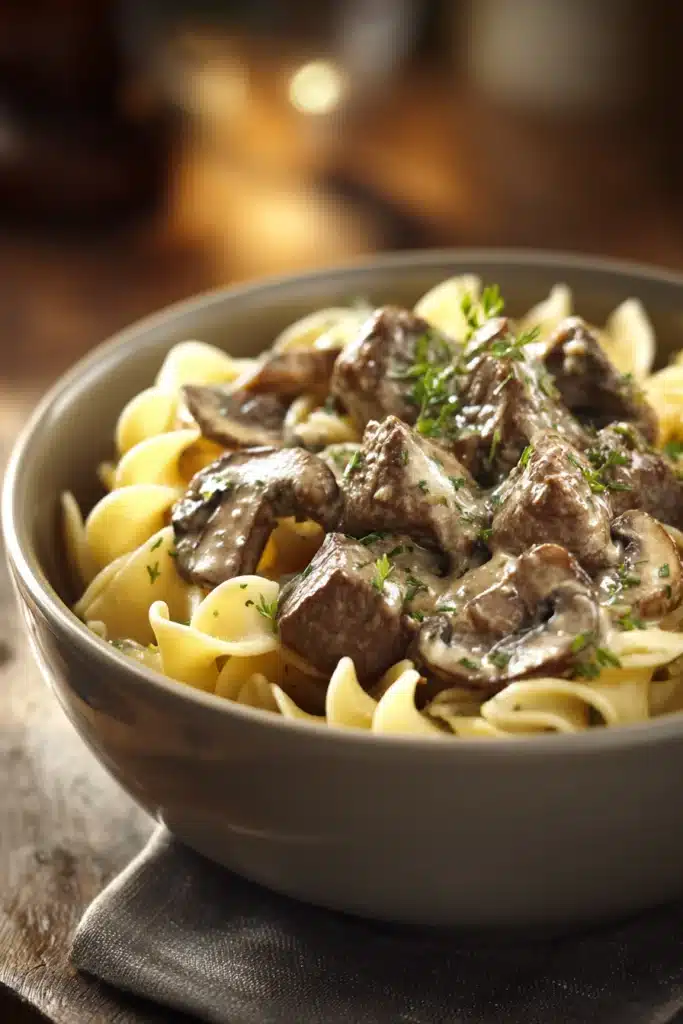 Dive into a cozy dinner with tender beef strips in a luscious mushroom sauce over egg noodles. This dish wraps you in warmth and satisfaction after any long day.