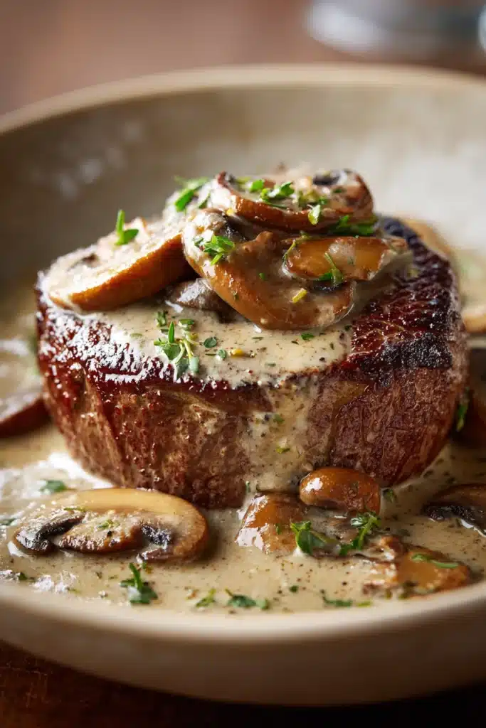 Savor the tender juiciness of filet mignon paired with a creamy mushroom sauce, perfect for intimate dinners or special evenings at home.