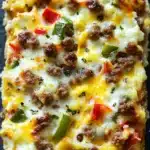 I usually use a standard baking dish, nothing fancy, and the casserole bakes up beautifully every time. It pairs well with fresh fruit or a simple green salad if you want to stretch it into a brunch. Sometimes, I swap the bell peppers for spinach or add mushrooms, depending on what’s in the fridge. If you’re not a sausage fan, cooked bacon or even a vegetarian sausage alternative can work — though I haven’t tested all of these swaps extensively, so results may vary. Also, using a mix of cheeses adds a bit more flavor depth, but mozzarella alone can be just fine if that’s what you have on hand.