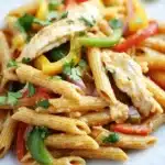 A delicious and nutritious high-protein chicken fajita pasta combining tender chicken breast, colorful bell peppers, and a creamy fajita-spiced sauce tossed with whole wheat pasta for a satisfying meal.