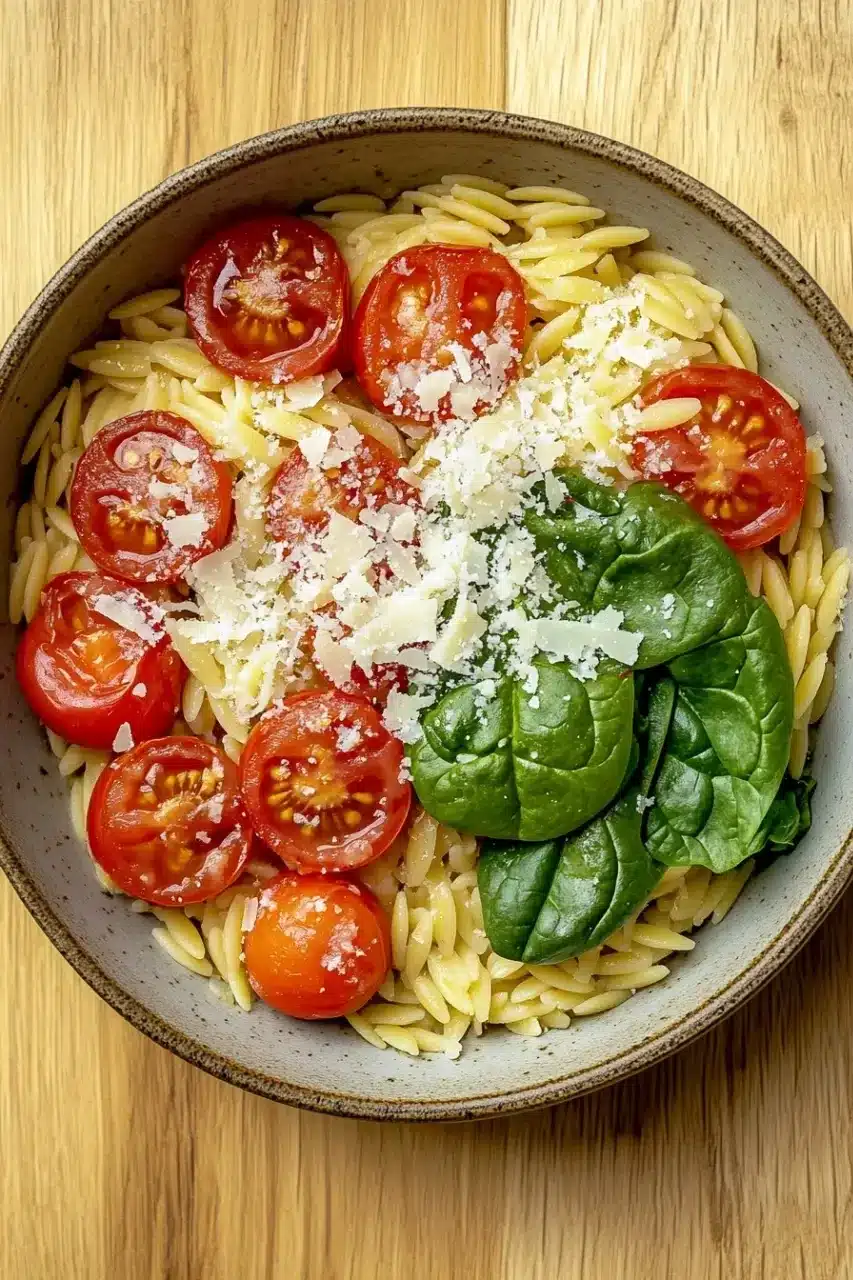 A quick and easy one pot pasta orzo recipe that combines tender orzo, fresh tomatoes, spinach, and Parmesan cheese for a delicious and comforting meal with minimal cleanup.