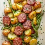 A hearty and flavorful one-pot meal featuring savory sausage, tender potatoes, and crisp green beans, all cooked together for an easy and satisfying dinner.