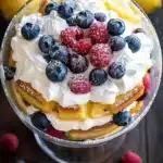 A bright and refreshing lemon cake trifle featuring layers of moist lemon cake, tangy lemon curd, fluffy whipped cream, and fresh berries. Perfect for spring and summer gatherings.