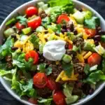 A delicious and nutritious high protein beef taco salad packed with seasoned ground beef, fresh vegetables, and a zesty dressing. Perfect for a satisfying meal that’s both flavorful and healthy.