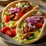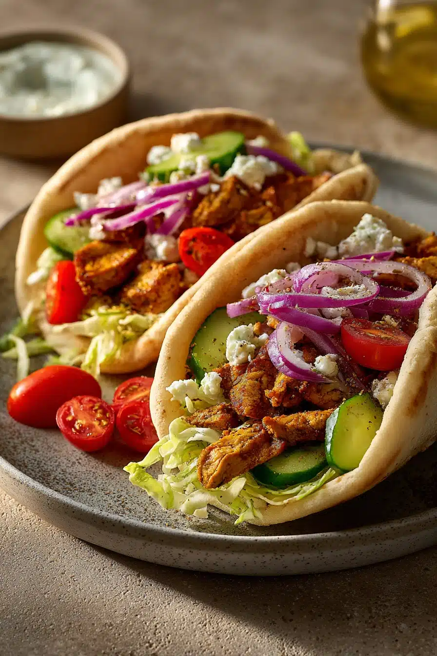 Delicious and savory Vegan Tempeh Gyros packed with Mediterranean flavors, served with fresh veggies and creamy vegan tzatziki sauce wrapped in warm pita bread. Perfect for a satisfying plant-based meal.