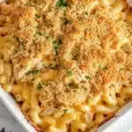 A comforting and hearty baked chicken mac and cheese casserole featuring tender chicken, creamy cheese sauce, and elbow macaroni, topped with a crispy breadcrumb crust.
