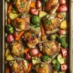 A simple and delicious one-pan meal featuring juicy oven-roasted chicken thighs and a medley of seasoned vegetables. Perfect for an easy weeknight dinner with minimal cleanup.