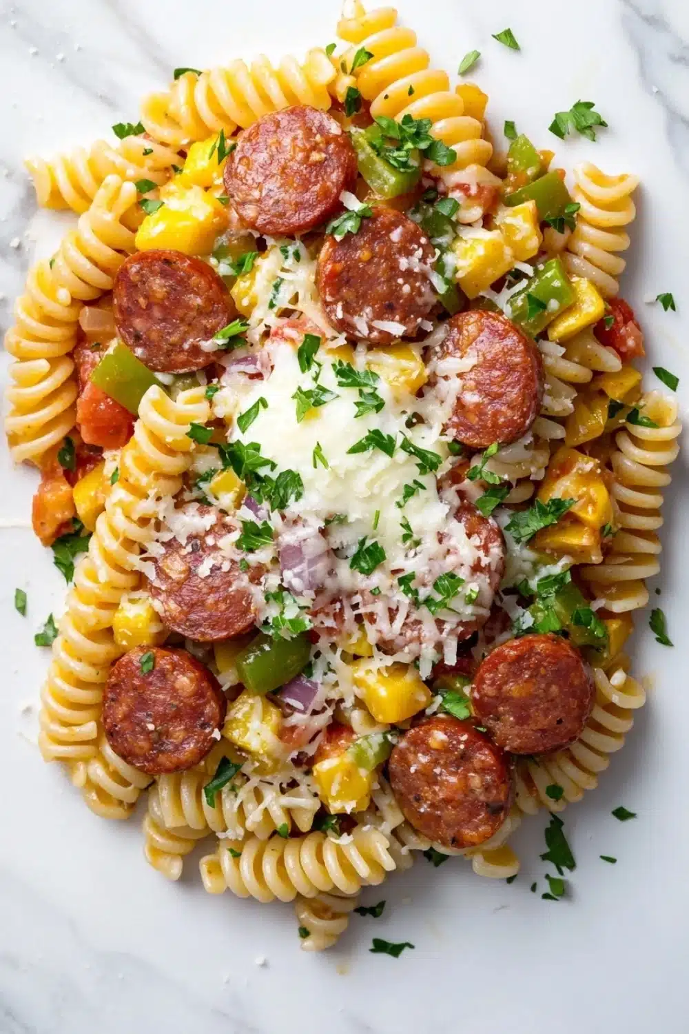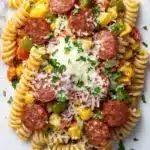 A hearty and flavorful pasta dish featuring savory kalbasa sausage, sautéed vegetables, and a rich tomato sauce, perfect for a satisfying weeknight dinner.