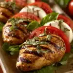 A fresh and flavorful Grilled Chicken Caprese Salad featuring juicy grilled chicken breasts, ripe tomatoes, creamy mozzarella, and fragrant basil, drizzled with a balsamic glaze and olive oil for a perfect light meal.