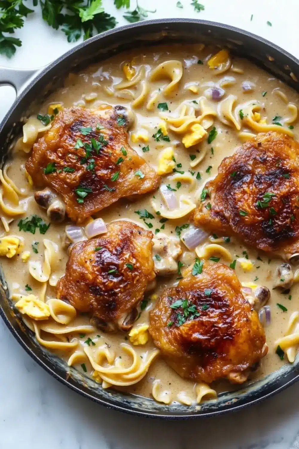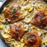 I remember the first time I tried this skillet dinner—it was one of those chilly evenings when I couldn’t quite decide what to make. The smell of crisping chicken skin filled the kitchen, and I was halfway through browning the thighs when I realized I’d been distracted by a text and almost forgot to stir the onions. That little pause, though, gave the garlic and herbs time to mingle in the pan, releasing a warmth that felt like a secret. Somewhere between the bubbling gravy and the tender noodles soaking up all the flavors, the kitchen felt alive and inviting. I don’t remember exactly how long I stood there savoring the aroma, but it was just long enough to make the wait worth it.